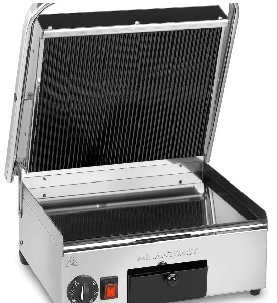 Sie ist einfach zu bedienen, mit einem Thermostat aus Edelstahl ausgestattet und eignet sich ideal zum Garen und Erhitzen von leckeren belegten Sandwiches, Toasts sowie zum Grillen von Fleisch, Fisch, Gemüse und Eiern bei hohen Temperaturen.